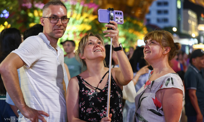 Foreign tourists visit Nguyen Hue flower street in downtown HCMC, January 2025. Photo by VnExpress/Quynh Tran