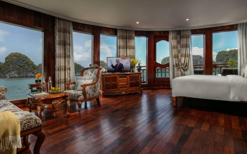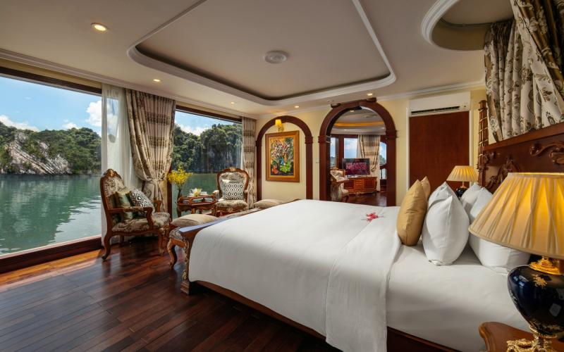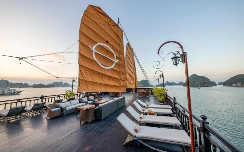 Experience the pinnacle of luxury aboard the Emperor Cruises Legacy Ha Long, a 5-star cruise that offers an all-inclusive Vietnamese cruising experience. Designed to reflect the opulence of the 1930s, this boutique cruise features only eight private cabins, each equipped with a private balcony and large windows that provide sweeping views of the breathtaking Ha Long Bay. Guests can enjoy personalized butler service, exquisite dining options, and a range of activities, including kayaking, cave exploration, and cultural demonstrations. The cruise also houses an art gallery, showcasing works by famous Vietnamese artists, adding a cultural touch to the luxurious journey. Whether you're seeking relaxation or adventure, Emperor Cruises Legacy Ha Long promises an unforgettable experience amidst the natural wonders of Ha Long Bay.
