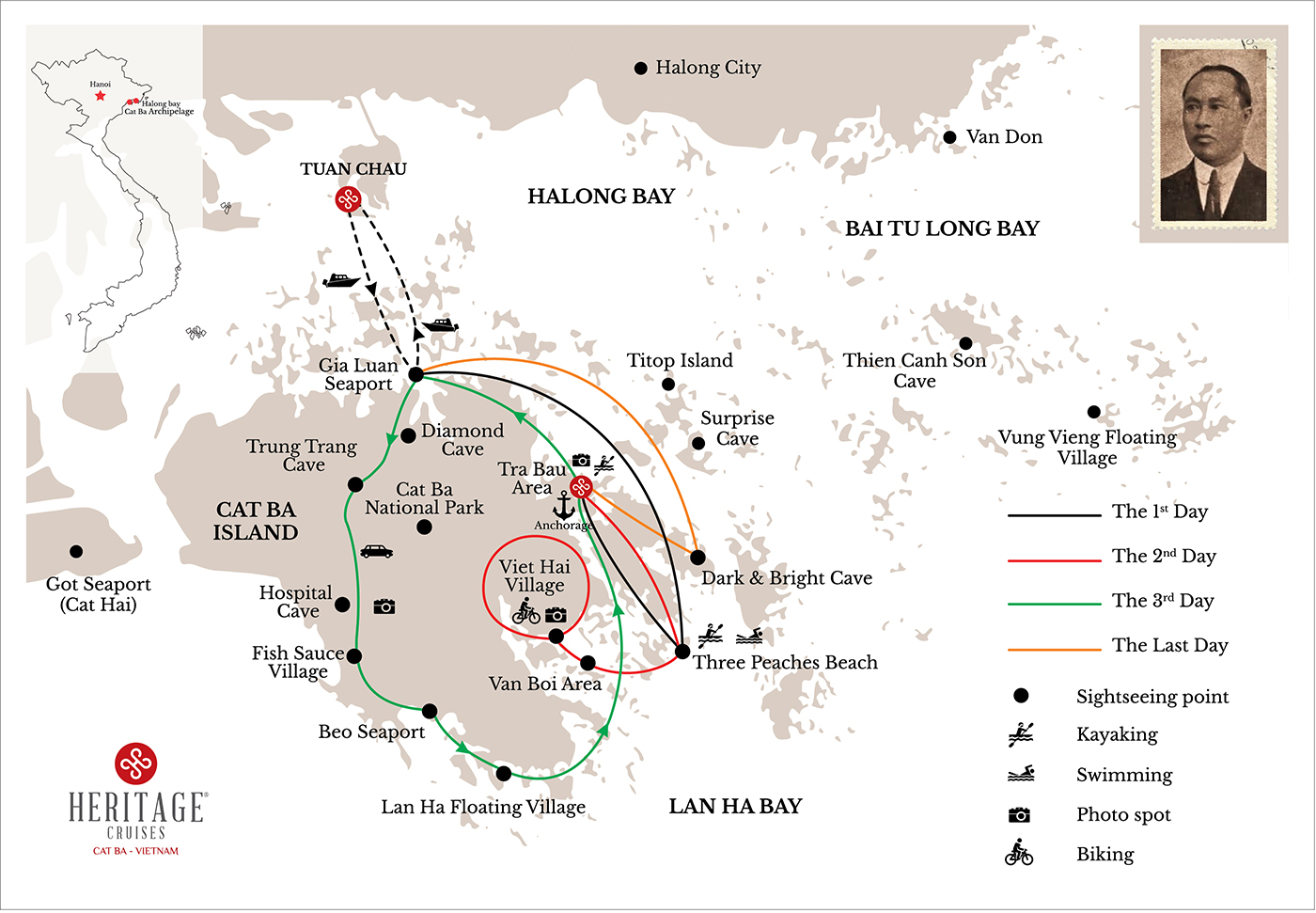 15:30: The cruise vessel approaches the Ba Trai Dao (Three Peach beaches) (upon the weather), or Tra Bau in Lan Ha Bay, a natural frontier between the provinces of Halong and Haiphong. This secret hideaway has beaches, caves, and coves, plus the spectacular natural beauty of about 400 islands. Guests can try kayaking or simply swimming in the crystal clear waters of the bay.
