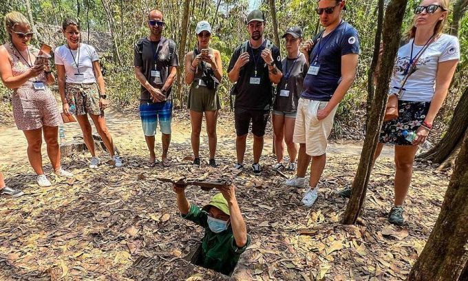 Foreign tourists watch a tour guide perform how to get through the entrances to Cu Chi Tunnels in HCMC. Photo by jwrach007 on Instagram