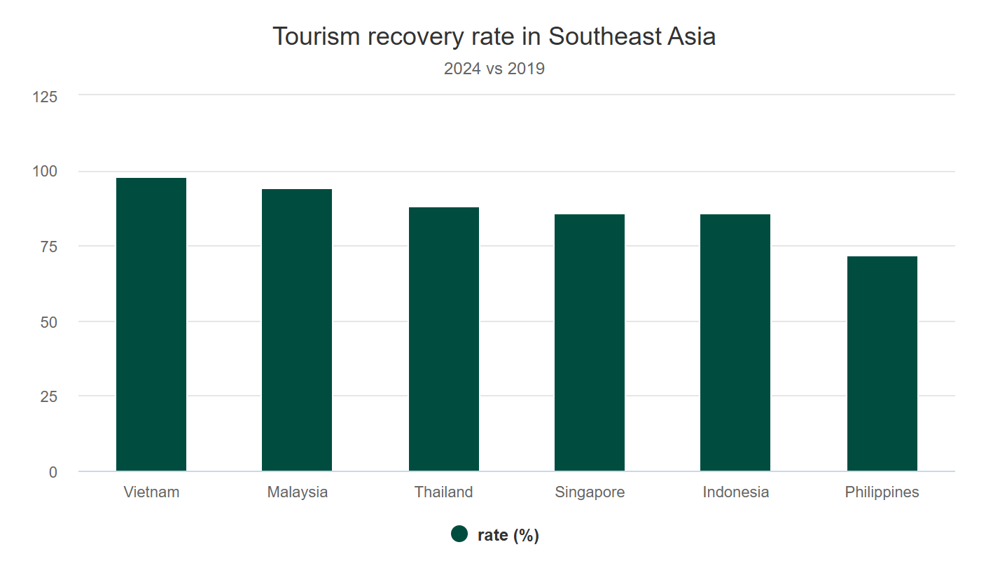 Tourism arrivals in Vietnam in 2024 recovered to 98% of pre-Covid levels, the highest in Southeast Asia, and this has been attributed to favorable visa policies.