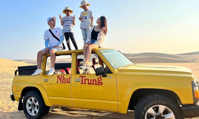 A family of South Korean tourists visit Bau Trang sand dune in Mui Ne, south central Vietnam. Photo by Nhu Trung