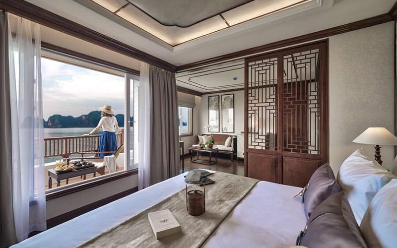 豪华住宿: 所有十二间宽敞的设计师套房都提供了兰哈湾豪华过夜游轮的最高标准和舒适度,包括一流的浴室、客房休息室和私人阳台。