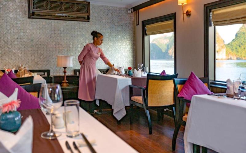 专属活动: 参加诸如皮划艇、参观浮动渔村、探索洞穴和参加烹饪课程等活动。 邮轮提供多种旅行项目,让客人沉浸在下龙湾的自然美景和文化遗产中。